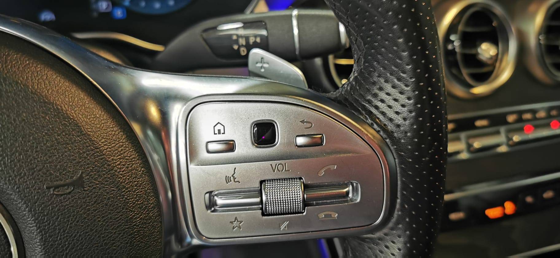 Volant Sport multifonctions à 3 branches revêtu de cuir Nappa noir, avec surpiqûre noire, méplat inférieur, marquages profonds dans la zone de préhension, boutons Touch-Control ainsi que bloc de commande et branches en finition chromée argentée galvanisée (Série)