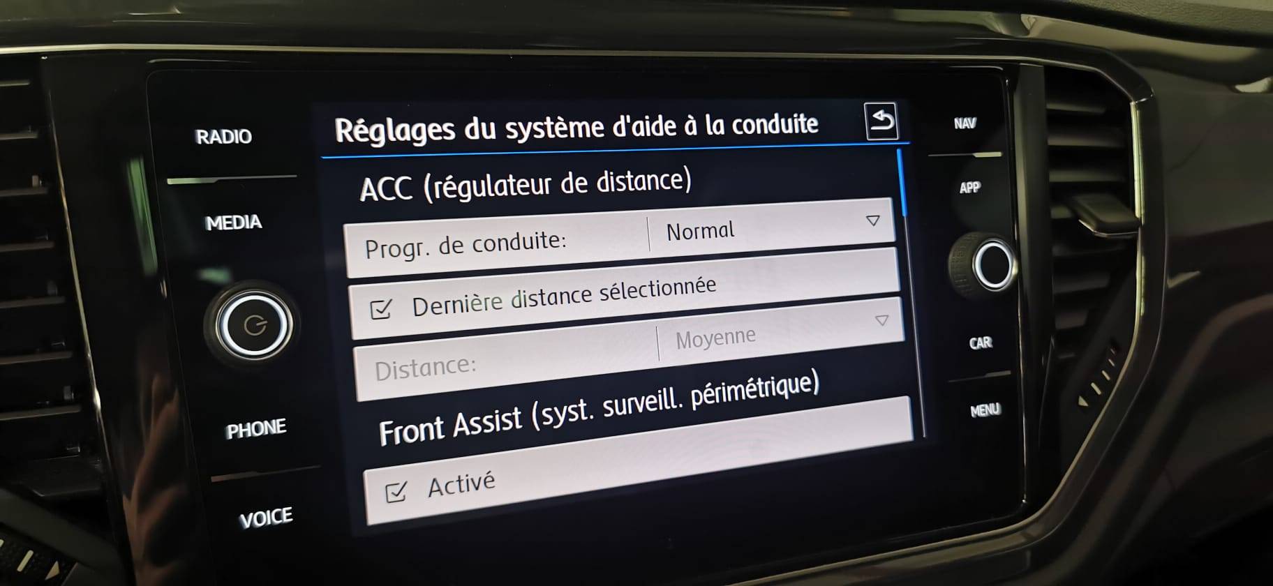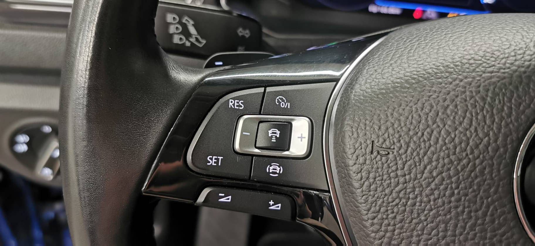 Régulateur de vitesse adaptatif ACC : détecte dans les limites du systéme et l´aide d´un capteur radar les véhicules qui précèdent et maintient la distance en intervenant sur les freins et l’accélérateur (régulation active de 30 à 160 km/h pour boîte manuelle, de 0 à 160 km/h pour boîte DSG ; jusqu’à l’arrêt du véhicule uniquement avec DSG). Le conducteur peut calibrer la distance souhaitée par rapport aux autres automobilistes selon quatre niveaux (Série)