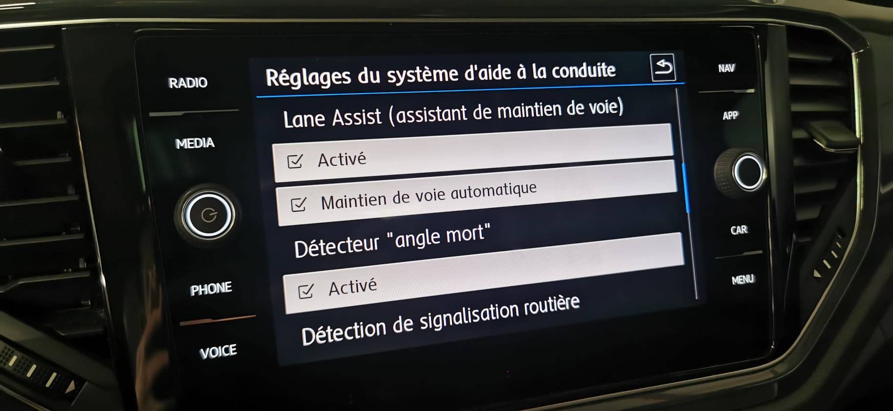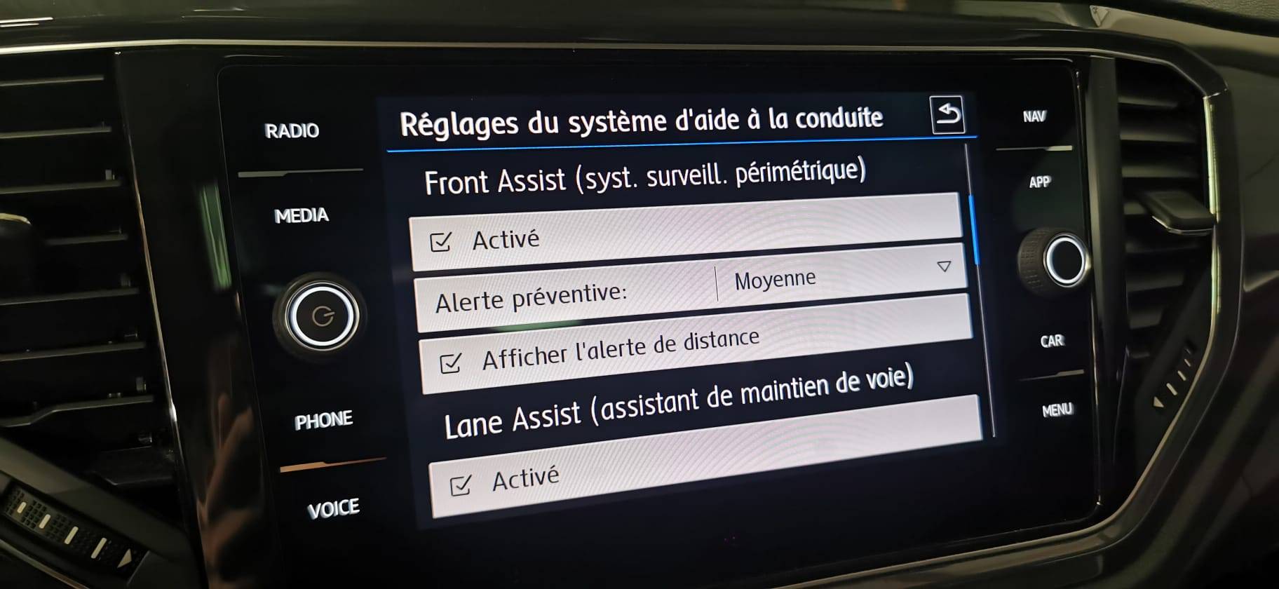 Dynamic Lane Assist: Assistant de maintien de trajectoire qui corrige, dans la limite du système, le mouvement du volant AV que le véhicule dépasse invonlontairement la bande de roulement. Système actif à partir de 65 km/h (Série)