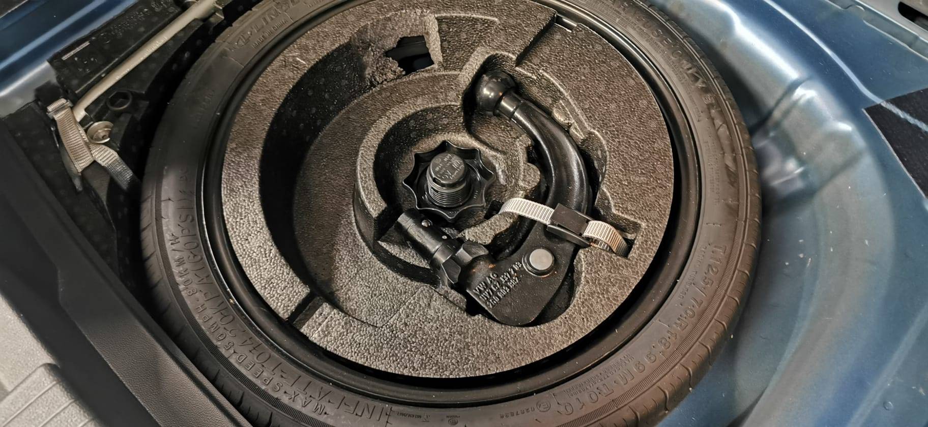 Roue de secours à encombrement réduit avec cric (vitesse limitée à 80 km/h) Remplace le kit de dépannage (Option)